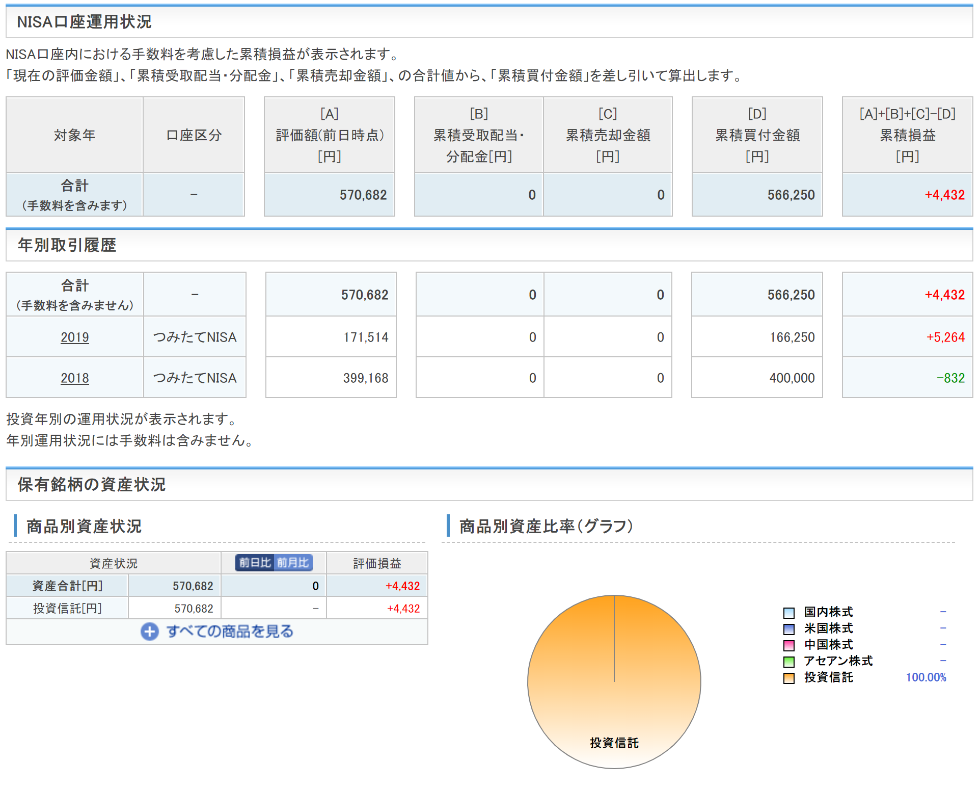 つみたてNISA経過報告(2019/5/19):先月から大幅ダウン 2019/5/19 つみたてNISA 2019年5月19日時点でのつみたてNISA経過報告です。 積立金額:¥566,250評価金額:¥570,682 (0.78%) 先月と比較すると大きく下がってしまいましたが、累計ではなんとかプラスの状態。ゴールデンウィークや日中貿易摩擦問題などマイナス要素が多かったので仕方がないのかなと思います。これから盛り返してくれればよいですが。。 つみたてNISAの経過まとめはこちら。 つみたてNISAの経過まとめページはこちら(2023年、2022年、2021年、2020年、2019年、2018年)。