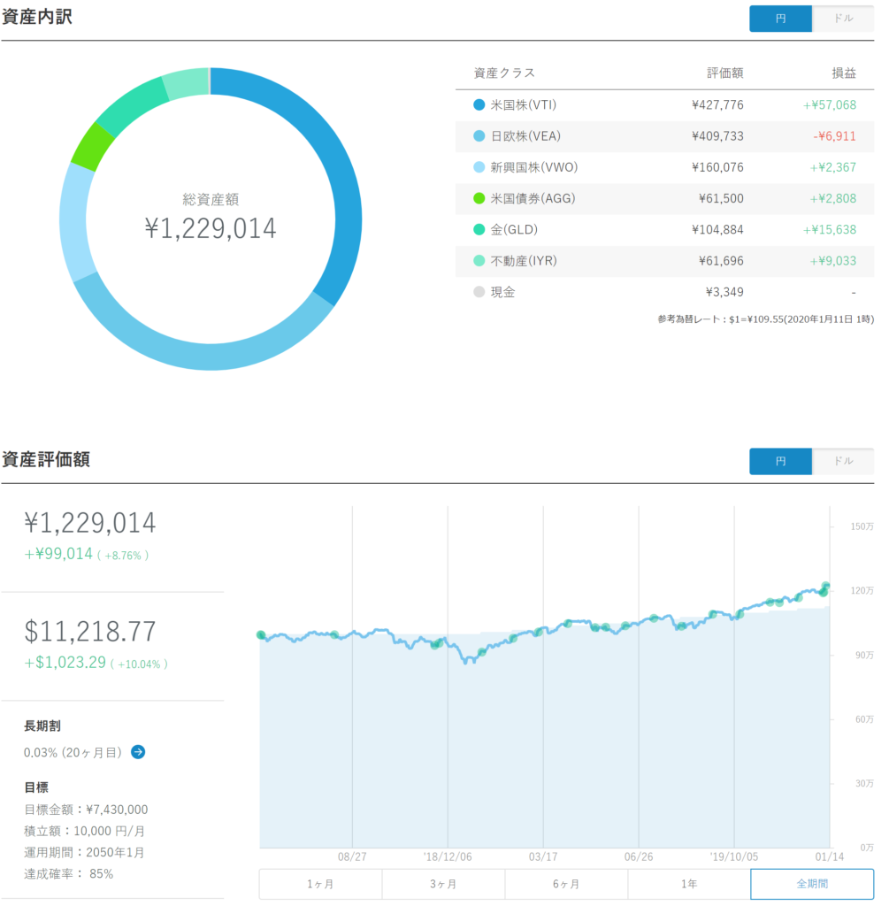 ウェルスナビ経過(2020/01/12):2.38%のプラス 2020/1/12 ウェルスナビ 2020年1月12日時点でのウェルスナビ経過報告です。 評価金額:¥1,229,014累計損益:¥99,014 (8.76%)前回からの損益: 2.38% 先週から2.38%のプラスとなりました。 ウェルスナビも楽ラップ同様運用コースを一段階上げています。同じように運用コースを上げた楽ラップが今のところほとんど変化なしなのに対し、ウェルスナビは2.38%のプラスとなりました。 ウェルスナビの経過まとめページはこちら(2023年、2022年、2021年、2020年、2019年、2018年)。